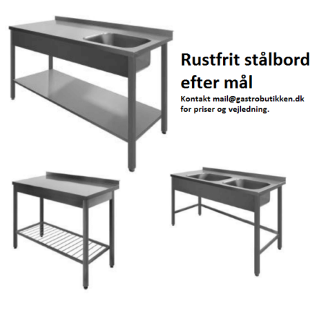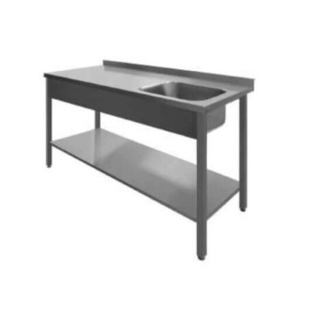 Dette 100% rustfri stålbord er designet med fokus på holdbarhed og funktionalitet, hvilket gør det ideelt til både professionelle køkkener og kvalitetsbevidste hjem. Den matte, glatte overflade modstår korrosion, pletter og varme, samtidig med at den er nem at rengøre. Bordet har en rektangulær form med lige kanter og en praktisk bagkant, der fungerer som stænkplade og beskytter vægge mod væskespild. Den integrerede vask i den ene side gør det nemt at skylle og rengøre, mens den åbne hylde under bordpladen giver ekstra plads til opbevaring af redskaber og rengøringsmidler, så arbejdsområdet holdes ryddeligt og effektivt.