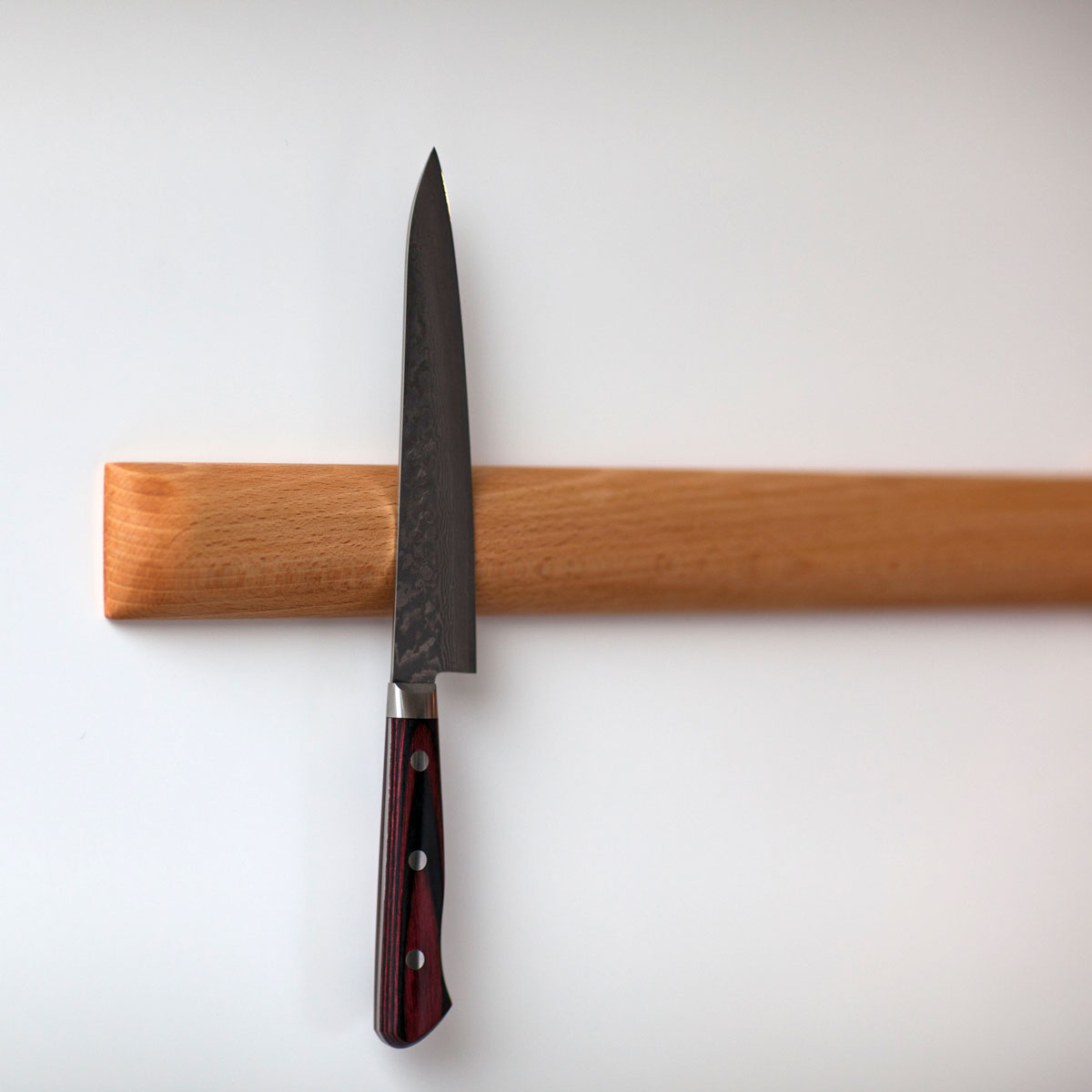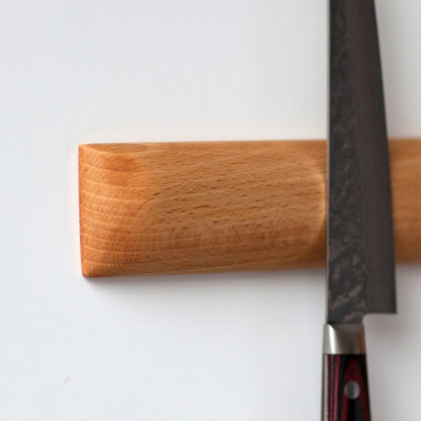 En elegant magnetskinne i massivt egetræ, der kombinerer holdbarhed med en varm, lysebrun tone og tydelige træårer, som giver et naturligt og tidløst udtryk. Med målene 45 x 4,2 x 1,9 cm er den ideel til opbevaring af flere knive på en pladsbesparende måde, uden at fylde unødigt i køkkenet. Den håndslibede, glatte overflade beskytter knivbladene mod ridser, mens den bløde, organiske form uden skarpe kanter sikrer sikker og behagelig håndtering. Den stærke magnet holder knivene sikkert på plads og giver nem adgang, hvilket skaber orden og effektivitet i både private og professionelle køkkener.