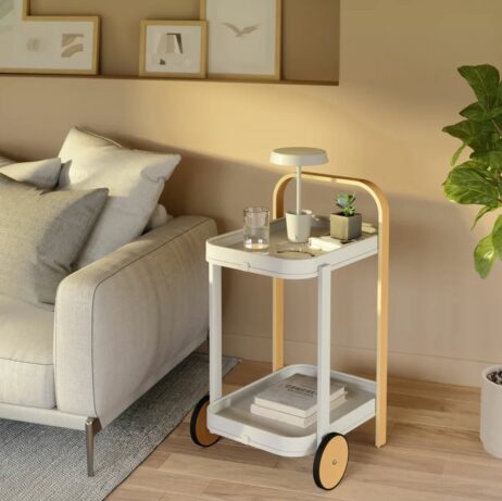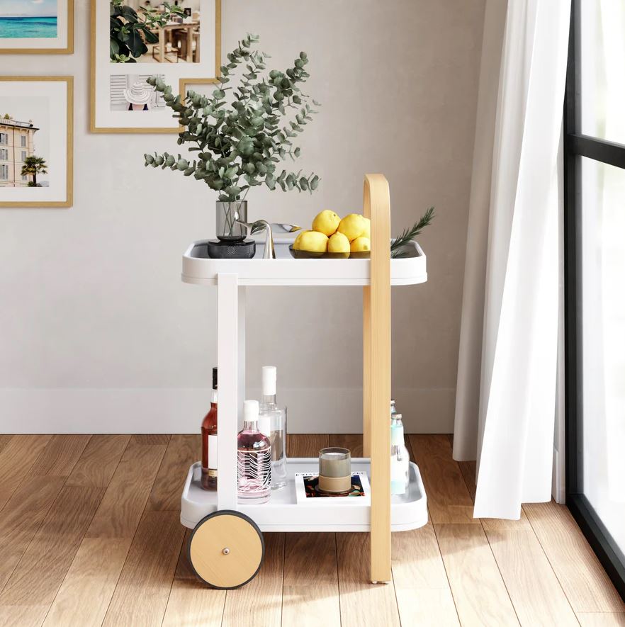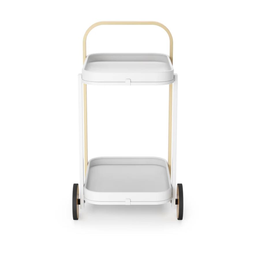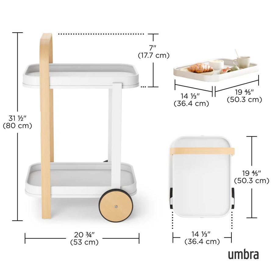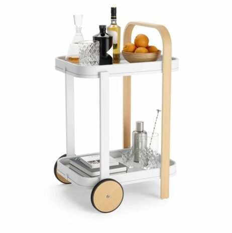 Vognen er designet med gummibelagte hjul, så du nemt kan flytte den rundt, uden at bekymre dig om ridser på gulvet. Øverste bakke kan let fjernes og anvendes som serveringsbakke til gæster eller snacks – perfekt til hyggelige stunder.