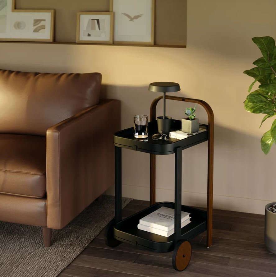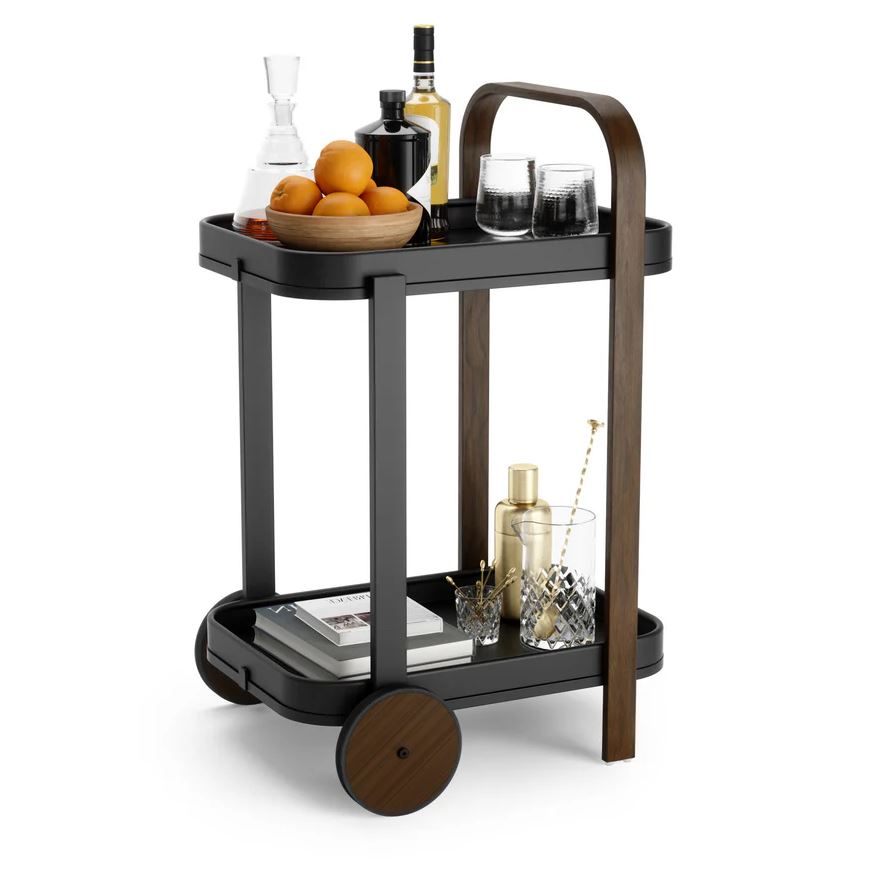 Denne moderne vogn i træ er yderst alsidig, og kan bruges både som en elegant hjemmebar, en plantevogn til dine yndlingsplanter eller som et praktisk sidebord.
