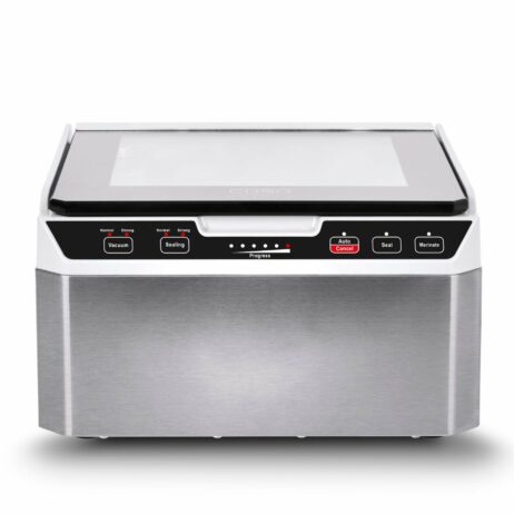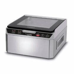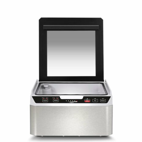 Denne vakuummaskine i børstet rustfrit stål kombinerer robusthed og æstetik i et kompakt format på 32 x 35,5 x 17,5 cm, der passer perfekt til både private og professionelle køkkener. Det hærdede glaslåg giver et tydeligt overblik over vakuumprocessen, mens det intuitive touch-kontrolpanel sikrer nem betjening. Med en kraftfuld pumpekapacitet på 70 liter pr. minut opnås næsten 100% vakuum, hvilket forlænger fødevarernes friskhed og smag. Den praktiske kammerstørrelse på 26,5 x 26,5 x 6 cm håndterer både større og mindre portioner, ideelt til opbevaring, sousvide-tilberedning og marinering af kød, fisk og andre råvarer.