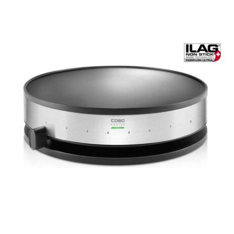 Denne crepeplade er designet til at levere professionelle resultater med en stor, cylinderformet bageplade på 33 cm i diameter, som giver rigelig plads til crepes i fuld størrelse. Overfladen er belagt med sort Ilag non-stick belægning, der sikrer, at dejen ikke brænder fast, og gør rengøringen enkel. Den børstede rustfri stålfinish bidrager til holdbarhed og et stilrent udtryk, der passer ind i både private og professionelle køkkener. Med 1300 watt opvarmes pladen hurtigt, og det støbte varmeelement sikrer en jævn varmefordeling for perfekte resultater hver gang.