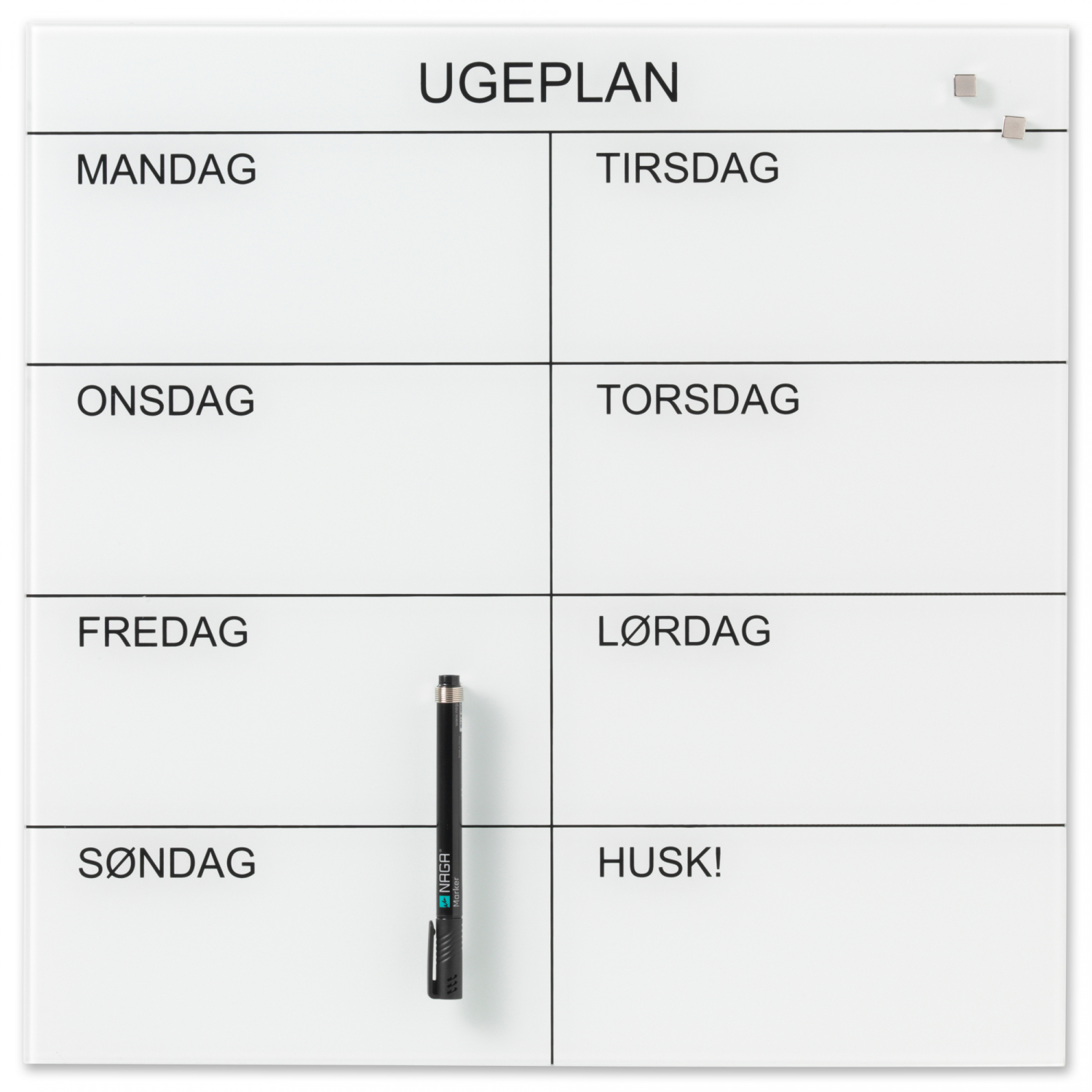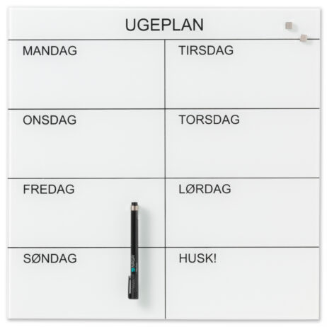 Magnetisk glas uge tavle 45 x 45 cm. Hvid. Dansk tekst. Skriv på tavlen med en marker, og sæt ting op på den med super stærke magneter. Gør det nemt at planlægge ugens aktiviteter. Tavlen leveres komplet med skruer, rawplugs, ophængs skabelon, 1 marker og 2 super stærke magneter. Leveres i gaveæske.