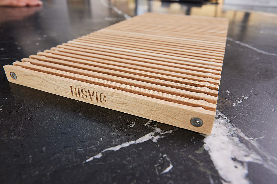 Flot gryderist fra Risvig, udviklet med henblik på at kunne stille sine gryder og pander på spisebordet, eller når man står og laver mad i køkkenet, men mangler et sted at stille gryder og pander. Risten er produceret i eg, og har dermed gode antibakterielle egenskaber. Gryderisten kommer ubehandlet, og derfor har den en lys eg farve. Hvis man vælger ikke at behandle træet med olie eller sæbe, skal man være opmærksom på, at træet har lettere ved at optage farve eller fedtstof. Gryderisten måler 38 x 19 cm.