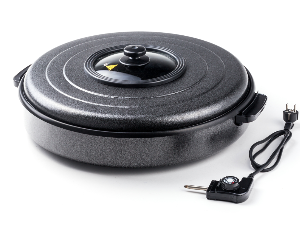 Hendi party pan er en aluminiumspande med non-stick belægning. Derudover medfølger der en flytbar termostat, låg med klart glas og 2 isolerede håndtag. Party panden er egnet til stegning, ristning og til at holde varm. Størrelse 400 mm: inderpande 400x(H)50 mm