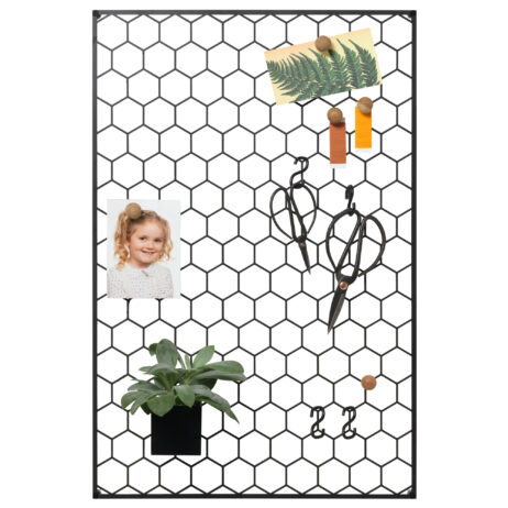 Dette hexagonale opslagstavle i sort metal er designet til effektiv opbevaring og organisering i både køkken og arbejdsrum. Med sine 40 x 60 cm passer det kompakte gitter til de fleste rum uden at dominere væggen. Den matte overflade giver et stilrent og minimalistisk udtryk, der komplementerer forskellige indretningstyper. Det sekskantede mønster skaber mange monteringspunkter, så du kan hænge alt fra køkkenredskaber til noter og billeder, både lodret og vandret. Den solide ramme sikrer stabilitet, mens den sorte farve fremhæver en tidløs æstetik og høj funktionalitet.