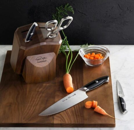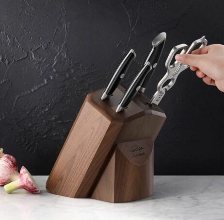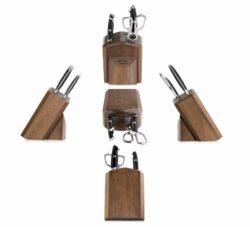 Udviklet i samarbejde med Michelin-kokken Thomas Keller og vinder af RED DOT Design Award 2019, kombinerer dette knivsæt avanceret håndværk med tidløst design. Den seks-trins varmebehandling sikrer en langtidsholdbar, knivskarp æg, leveret klar til brug med håndslebet finish. Den kompakte knivblok i massivt træ giver stabilitet og pladsbesparende opbevaring, ideel til både private og professionelle køkkener. Køkkensaksen i rustfrit stål er ergonomisk og alsidig, perfekt til alt fra krydderurter til pakkeåbning. Sættet balancerer holdbarhed, funktionalitet og æstetik til passionerede amatørkokke og professionelle.