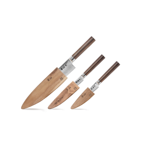 Disse håndslebede knive består af damaskus VG10 stål og Rich, ultra-dense African Blackwood håndtag, der som helhed giver maks komfort og et afbalanceret snit. Alle knive kommer med magnetisk Saya style cover i valnødetræ, som beskytter knivbladene.
