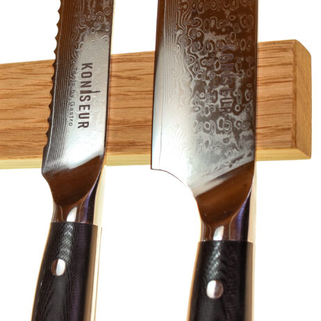 Knivskinnen laves af massiv egetræ, røget eg eller valnød og du vil få svært ved at gætte hvordan vi har fået puttet magneterne ind i den