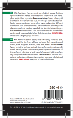 Brugsanvisning: Sprayes på fryserens eller køleskabets indvendige sider. Efter 15 minutters virketid aftørres med en opvredet klud. Afvaskning med vand er kun påkrævet, hvor fødemidler kommer i direkte kontakt med den afrensede overflade.