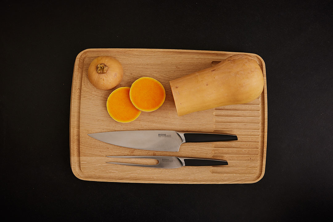 Actus serien fra Risvig er produceret og udviklet i tæt samarbejde med Hjortsminde slagteri. Her har man fået en samarbejdspartner der har over 30 års erfaring med anvendelse af knive, altså en ekspert inden for sit område. Køkkenknivene af damaskusstål er med et blad af den bedste kvalitet – et blad der ikke bliver sløvt. På Risvis Design’s damask kokkekniv er der fokus på en let kniv, der sikrer en rigtig god balance smat ligger godt i hånden. Damascus knivene er let genkendelige i designet, der er kendetegnet ved det flotte mønster i stålet.