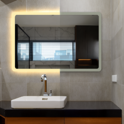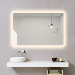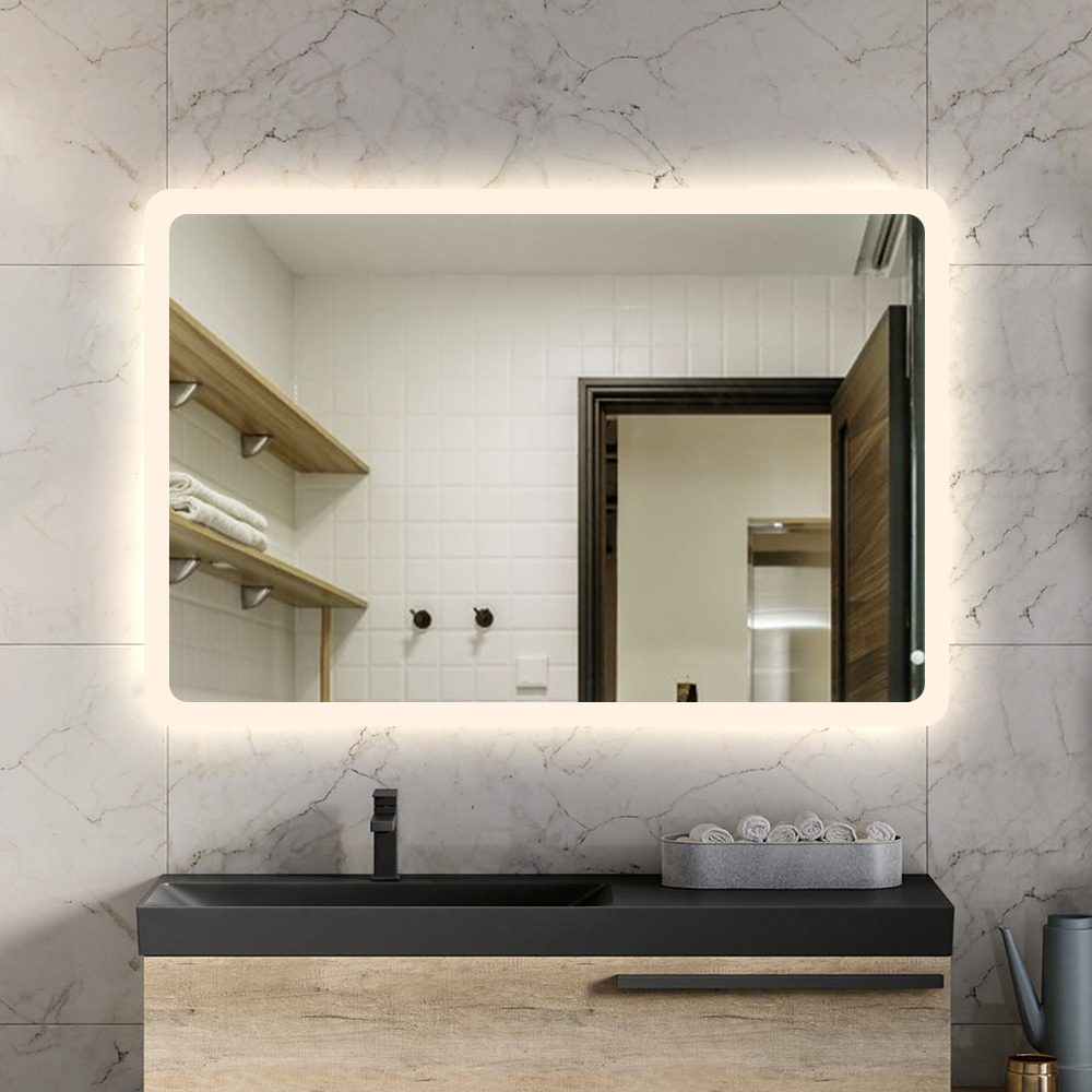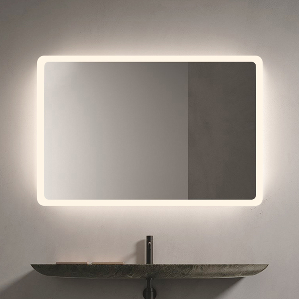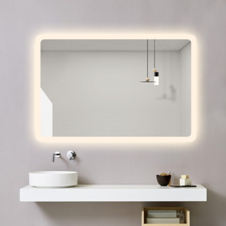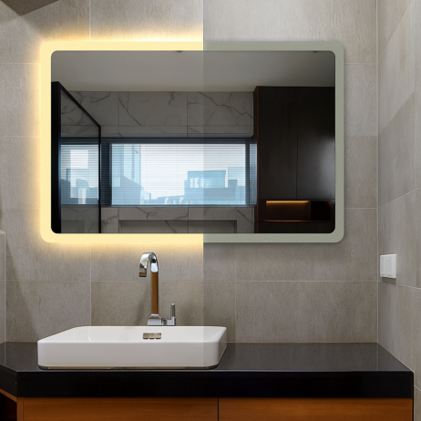 Dette badeværelsesspejl kombinerer funktionalitet og kvalitet med en 5 mm tyk spejlflade i sølv- og kobberfrit glas, som sikrer en klar og reflekterende overflade uden misfarvning. Den rektangulære form med bløde, afrundede hjørner og den integrerede LED-ramme i varmt hvidt lys (3000 Kelvin) skaber behagelig og ensartet belysning, der understøtter præcis farvegengivelse med en CRI-værdi over 80. Spejlet er designet til både private badeværelser og professionelle miljøer, hvor det leverer optimal belysning til makeup, barbering og personlig pleje. Den slanke profil og minimalistiske design gør det let at integrere i enhver indretning, mens den robuste konstruktion sikrer langvarig holdbarhed.