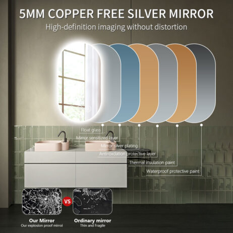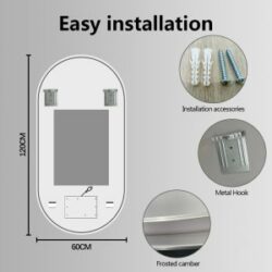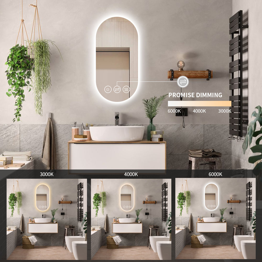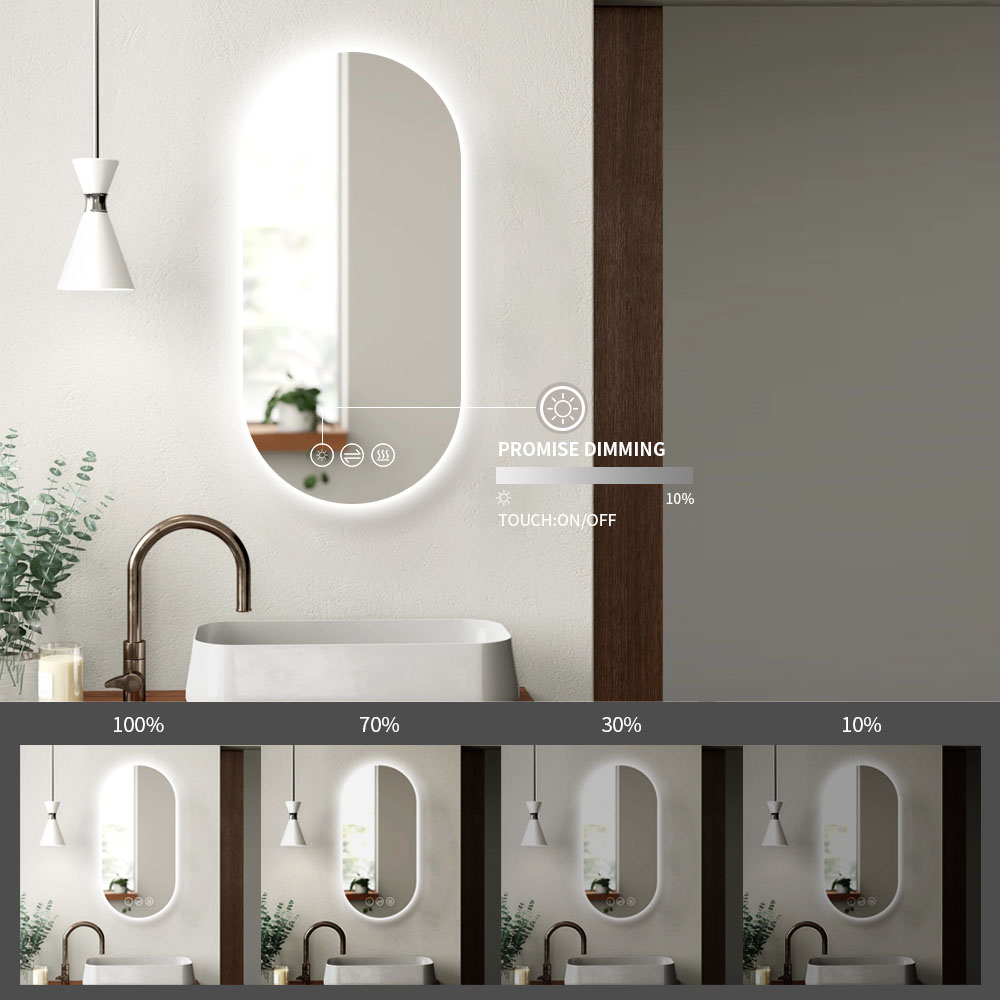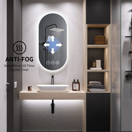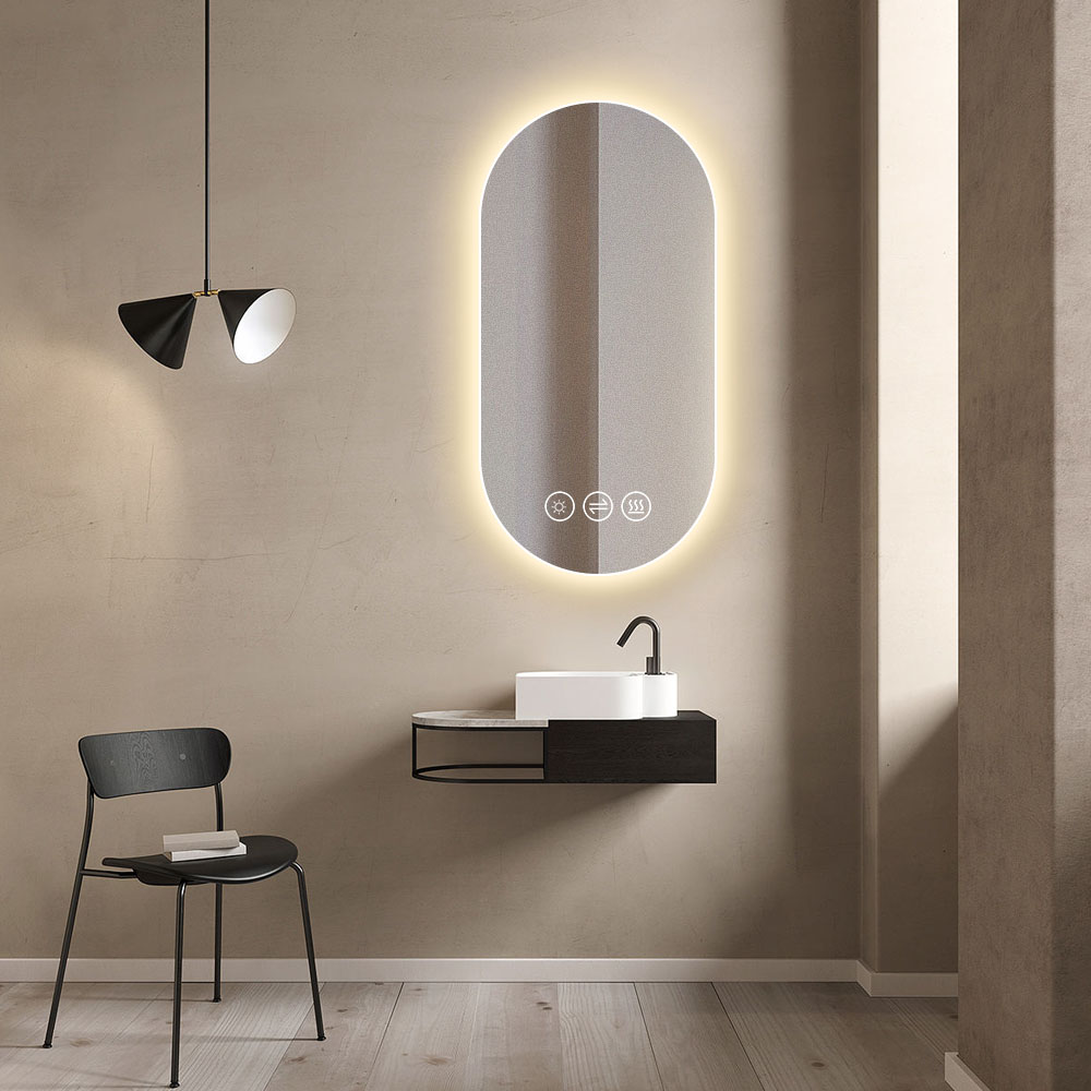 Dette spejl kombinerer 5 mm tykt sølv- og kobberfrit glas med en slank, oval form, der passer perfekt til både små og store badeværelser. Den indbyggede LED-lysramme udsender et blændfrit, naturligt varmt hvidt lys (3000 Kelvin), som sikrer optimal belysning uden hårde skygger. Spejlets afslebne kanter og minimalistiske design giver et elegant og raffineret udtryk, mens den robuste brudsikre behandling og anti-korrosionsbeskyttelse sikrer lang holdbarhed i fugtige miljøer. Med IP44-certificering er spejlet ideelt til vådrum, og den indbyggede touchsensor gør det nemt at tænde og slukke både lys og antidugfunktion, hvilket øger brugervenligheden markant.