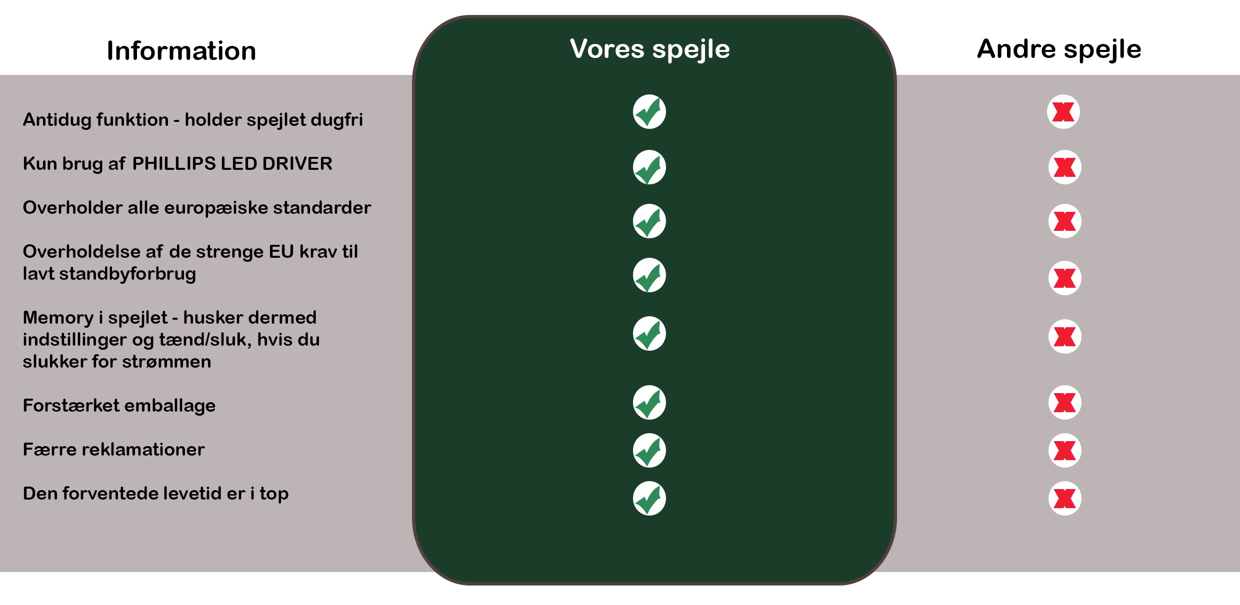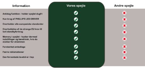 –   Et spejl der overholder de strenge EU krav til lavt standby forbrug.