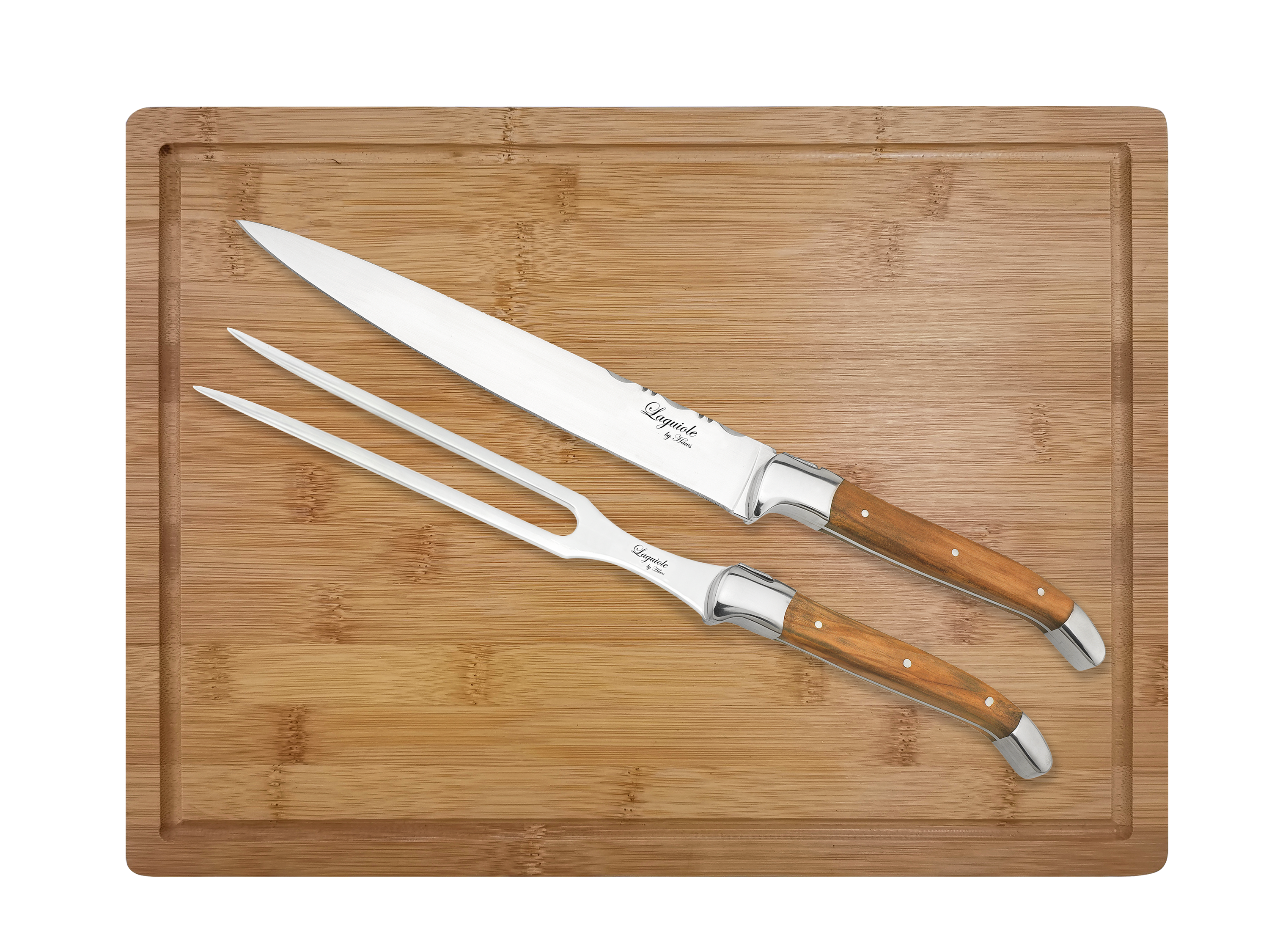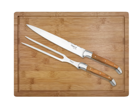 Laguiole er opkaldt efter en fransk landsby og henviser til den særlige form, som forskærersættet har. Sættet er fremstillet i rustfrit stål (420) med håndtag i oliventræ. Skærebrættet med saftrille er udformet i bambus.