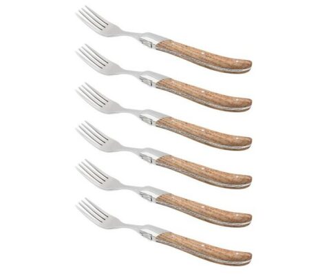 Steak gaflerne er lavet af 420 rustfrit stål og mærket med et cikade logo. Sættet består af 6 steak gafler med håndtag af oak en sort trææske. Det er muligt at få matchende steak knive til sættet.
