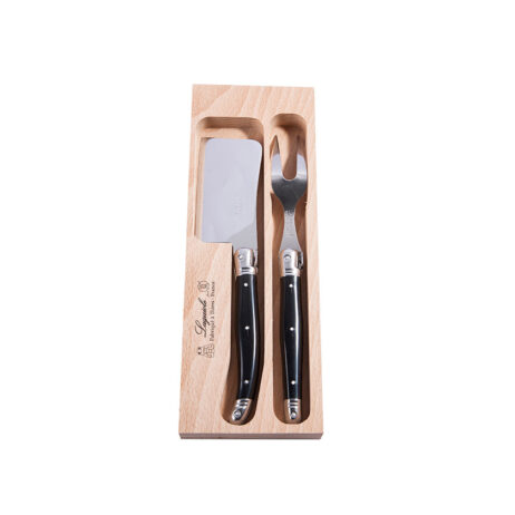 Laguiole ostesæt i sort bestående af 1 oste-kløver og 1 gaffel. Den lille oste-kløver gør det nemt at skære halvhårde oste uden problemer.