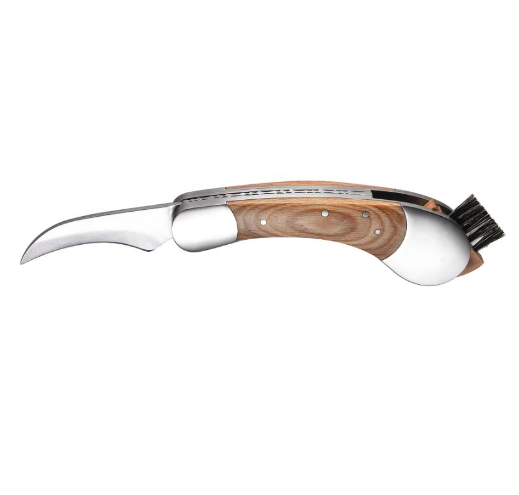 Flot svampekniv fra Legnoart Pocino. Den består af en kniv, et skaft produceret i lyst træ og en børste, til at rengøre svampen.