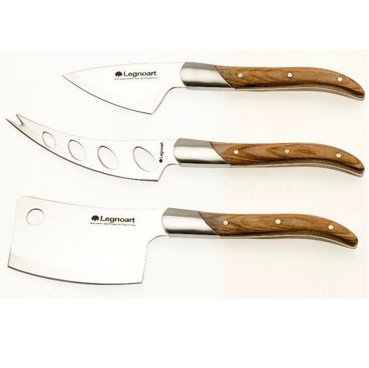 Dette osteknivsæt er fremstillet i højkvalitets 420 japansk stål, der sikrer en skarp og holdbar skærekant, perfekt til både bløde, hårde og cremede oste. Knivene har et elegant design med blankpolerede blade, hvor Legnoart-logoet er diskret indgraveret tæt ved bolsteren, hvilket vidner om kompromisløs kvalitet. Håndtagene består af lyst, naturligt træ med synlige årer og en mat finish, som giver et varmt og eksklusivt udtryk samt et sikkert og behageligt greb. Det ergonomisk udformede skaft sikrer optimal kontrol og komfort ved præcisionsskæring, mens den velafbalancerede vægtfordeling gør knivene velegnede til både hjemmebrug og professionelle køkkener. Sættets kompakte størrelse gør det nemt at opbevare og anvende i enhver køkkensituation.