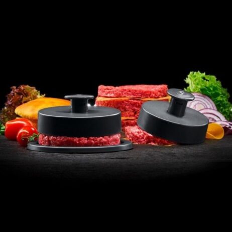 Disse bøfformer i sæt med to størrelser giver mulighed for at forme perfekte burgerbøffer med diameter på 10,8 cm og 9,3 cm. Fremstillet i robust, fødevaresikker plast med en mat sort finish sikrer de stabil og ergonomisk håndtering takket være det hævede kantdesign og det runde greb med præget logo. Den glatte overflade minimerer fastklæbning af fars, mens den flade bund garanterer ensartet tykkelse og form, hvilket giver jævnt stegte bøffer med et professionelt udseende. Bøfformene er lette at adskille, hvilket forenkler rengøringen og opretholder høj hygiejne under brug. De kompakte dimensioner gør dem nemme at opbevare uden at fylde unødigt i køkkenskuffen.