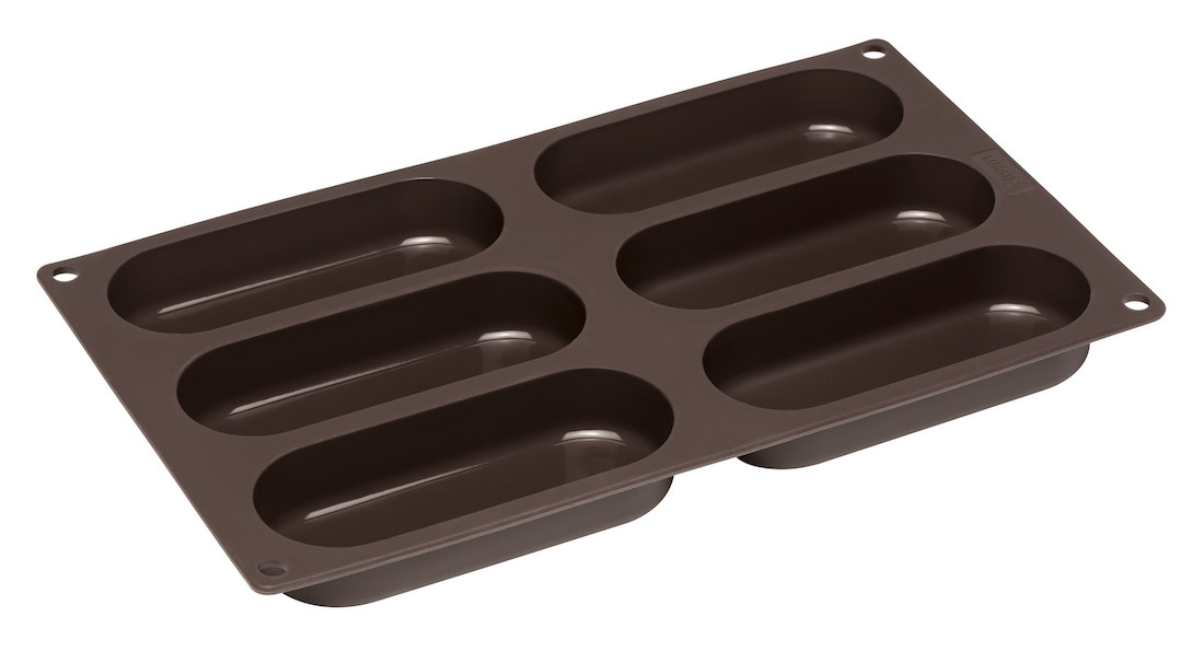 Formen er udført i blødt, fødevaregodkendt silikone i en varm brun nuance, der sikrer nem og skånsom udtagning af bagværk uden at gå på kompromis med formens stabilitet. Med plads til seks aflangt formede portioner er den ideel til at bage traditionelle danske hotdogs eller skolebrød i én omgang. Den matte overflade bidrager til de non-stick egenskaber, så der sjældent er behov for at smøre formen, hvilket forenkler både forberedelse og rengøring. Dimensionerne er tilpasset standard ovnplader, og den kompakte konstruktion muliggør nem opbevaring, enten i køkkenskuffen eller hængende takket være praktiske ophængshuller i hjørnerne.