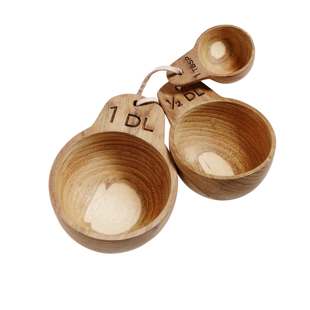 Måleske-sæt Emma fra Muubs. Træske-sættet som er perfekt til bagværk er skabt af naturlig teak, som er lækker, ikke blot at holde ved, men også at se på. Brug læderstroppen til at hænge skeerne i køkkenet eller placer dem i skuffen.