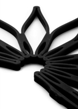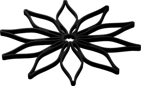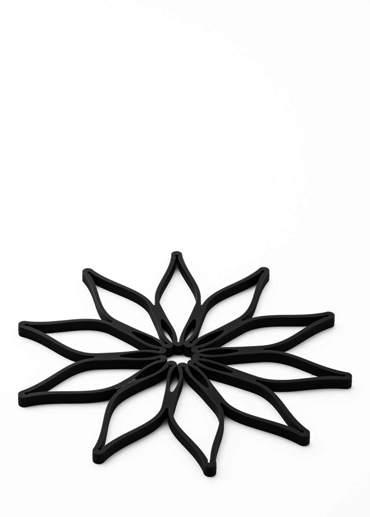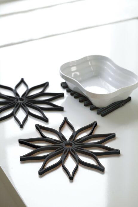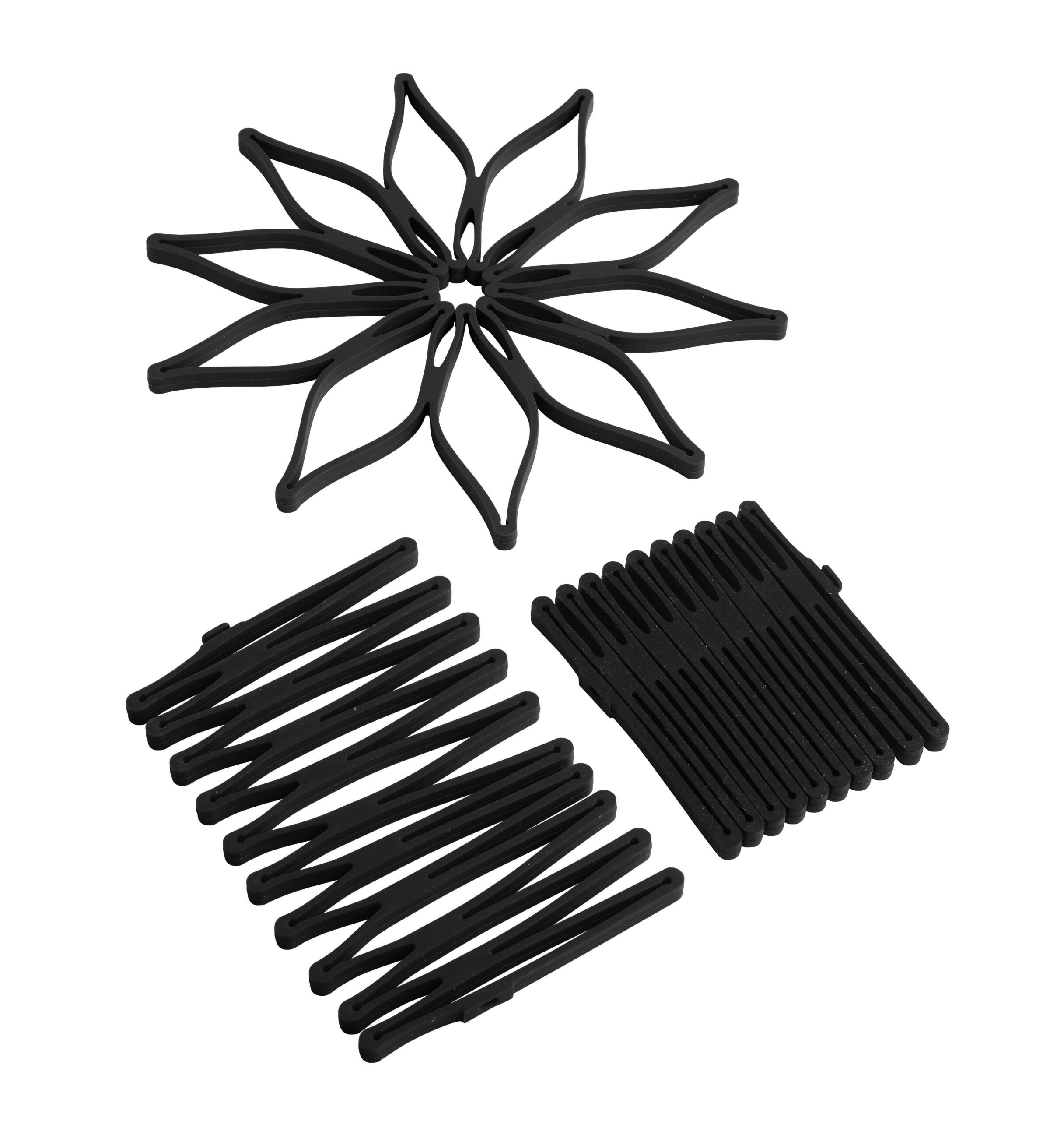 Magic Trivet bordskånere i sort silikone, 3-pak. Smart design, som kan åbnes og foldes ud til en lang bordskåner til et fad eller som en stjerne.