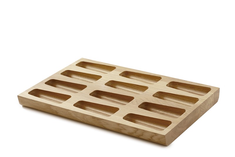 Dette indsats i massiv eg er designet til at organisere op til 12 krydderiglas med en perfekt pasform til standard 40 cm Blum-skuffer. Fremstillet af lyst, naturligt egetræ med tydelige årer, kombinerer det æstetik med funktionalitet, hvor den glatte, polerede overflade giver en behagelig taktil oplevelse og en varm, organisk udstråling i køkkenet. De dybt fremskårne, aflange ovale rum sikrer, at krydderiglassene står stabilt og let tilgængeligt, hvilket effektivt optimerer pladsen og holder orden i køkkenskuffen uden risiko for væltning eller støj ved åbning og lukning.