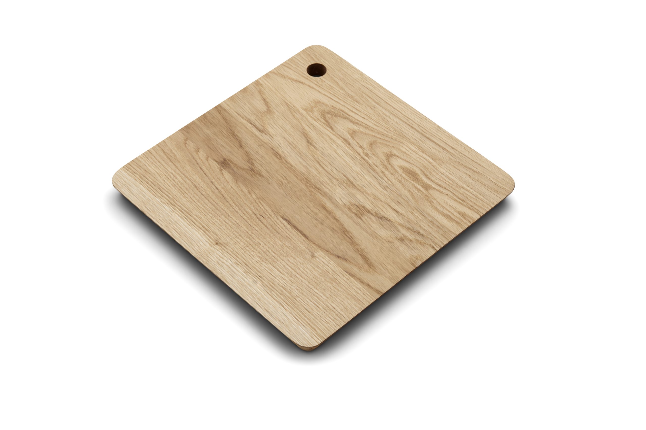 Kvadratisk skærebræt produceret i Danmark i olieret dansk eg . Højden er 2 cm med 4 skrå sider, så brættet er nemt at tage op fra bordpladen. Brættet har også et hul i det ene hjørne, så det kan hænges op. Kan bruges som smørebræt, til brunch anretning, som serveringsbræt af alt lige fra tapas til kager og desserter. Produceret bæredygtigt i Danmark af dansk egetræ.