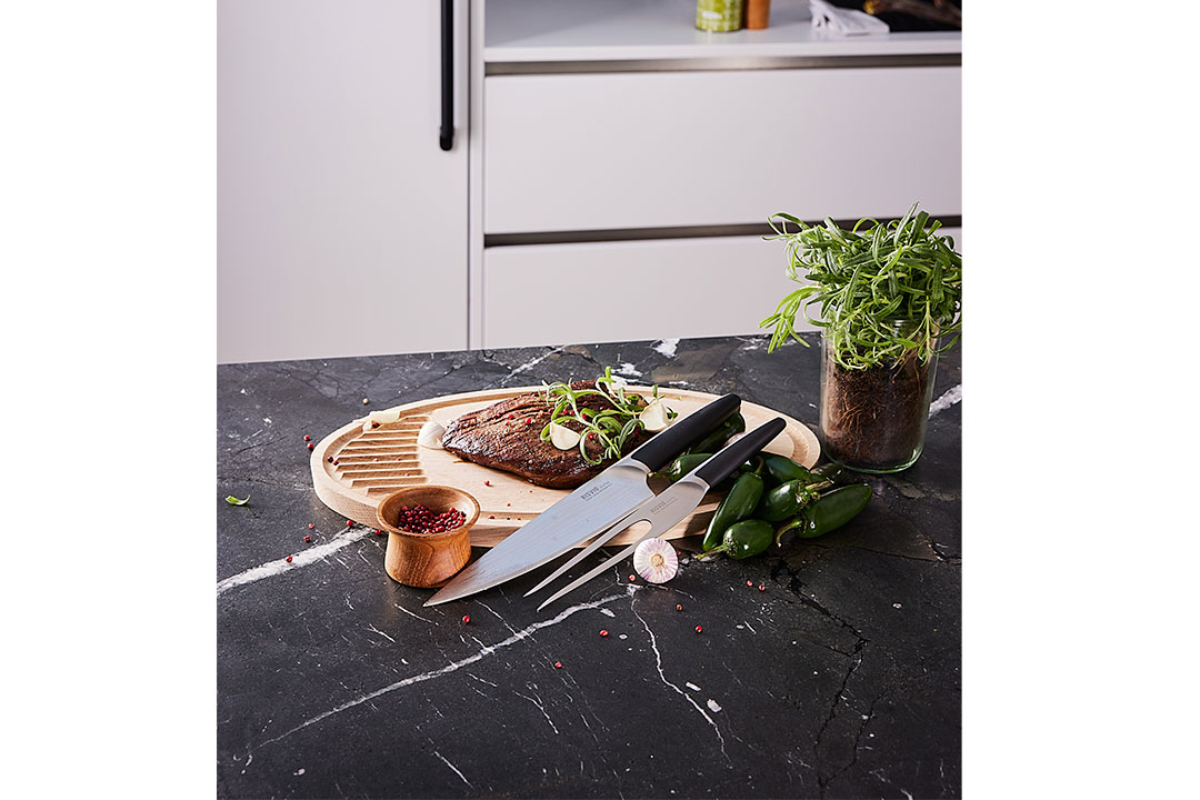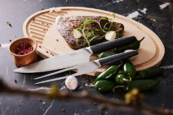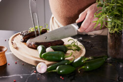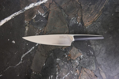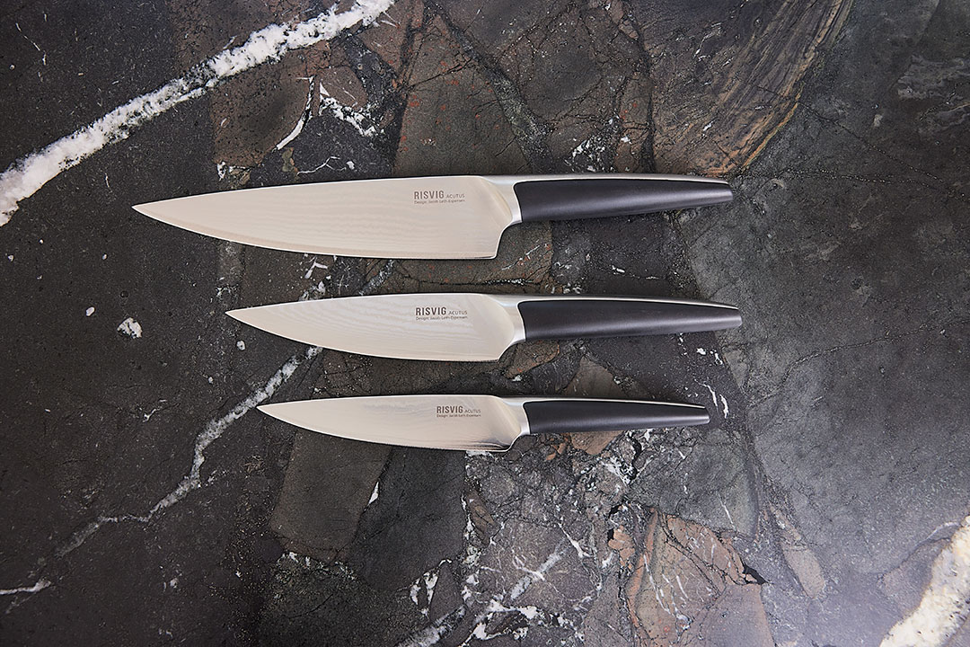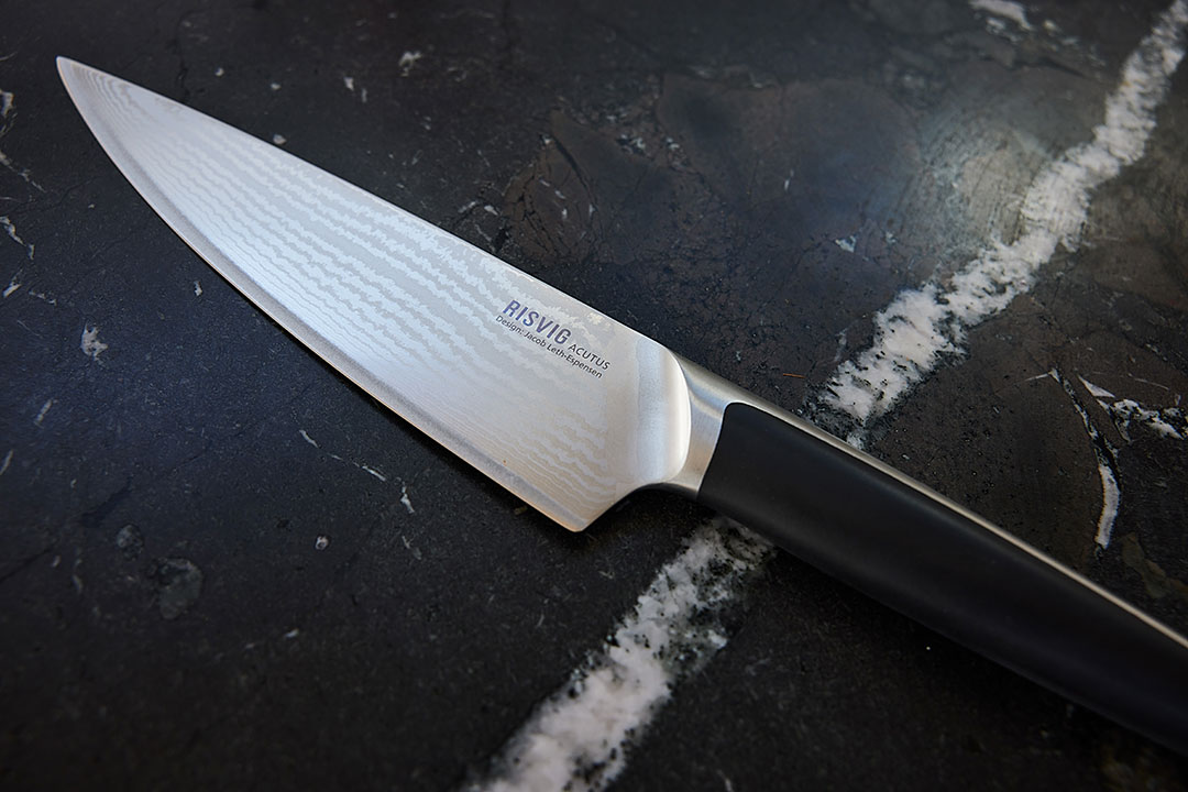 Actus serien fra Risvig er produceret og udviklet i tæt samarbejde med Hjortsminde slagteri. Her har man fået en samarbejdspartner der har over 30 års erfaring med anvendelse af knive, altså en ekspert inden for sit område. Køkkenknivene af damaskusstål er med et blad af den bedste kvalitet – et blad der ikke bliver sløvt. På Risvis Design’s damask kokkekniv er der fokus på en let kniv, der sikrer en rigtig god balance smat ligger godt i hånden. Damascus knivene er let genkendelige i designet, der er kendetegnet ved det flotte mønster i stålet.