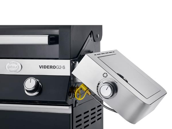 Rösle Videro G6-S gasgrill med mange funktioner. 6 hovedbrændere af rustfrit stål (hver 3,5 kW). Hovedgrillområde: 92,5 × 45 cm, opvarmningsstativ: 92,5 × 16 cm. Inkl. VARIO + grillsystem med holder. Kraftigt grillgitter af emaljeret støbejern giver de klassiske grillstriber.