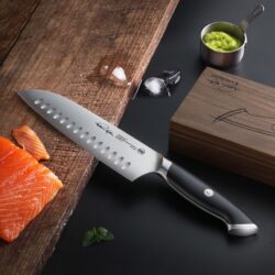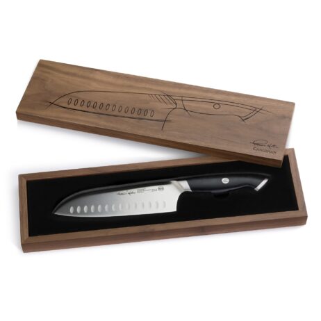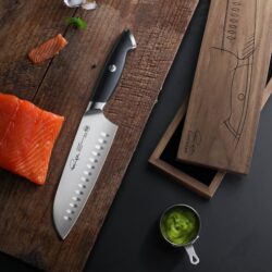 Knivens avancerede varmebehandling og håndslebet finish sikrer en ekstremt skarp og slidstærk klinge med høj korrosionsbestandighed. Det ergonomiske skaft i robust materiale giver langvarig komfort og præcis kontrol, selv ved længerevarende brug. Den prisvindende designprofil, der har modtaget Red Dot Design Award, kombinerer stil med praktisk funktionalitet. Leveres i en eksklusiv trææske med kunstnerisk skitse og signatur, hvilket gør kniven til en oplagt gaveidé. Ideel til kokke, der værdsætter kvalitet, præcision og æstetik i et professionelt køkkenmiljø.