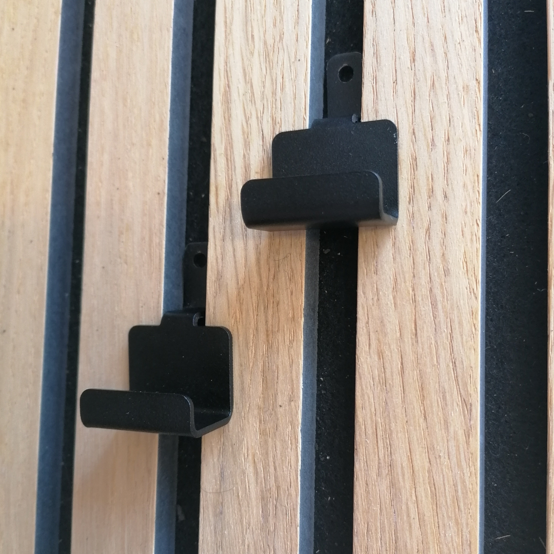 MDF: Sort gennemfarvet FSC Certificeret. Vi anbefaler man limer afslutningslisten direkte på væggen, op mod det løse filt i den ene side af panelet. Kan også skrues op, men disse vil være synlige.