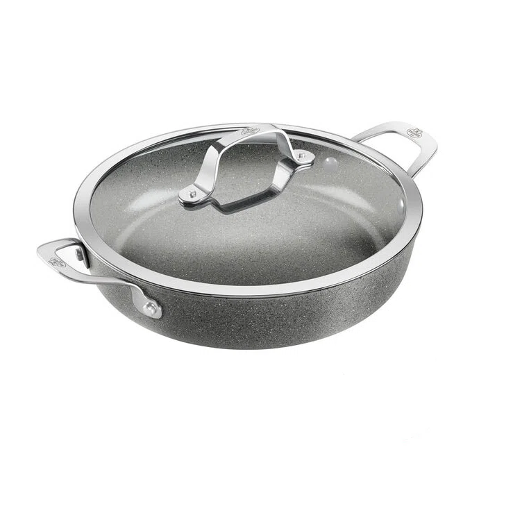 Det ergonomiske håndtag i rustfrit stål er udstyret med stay-cool funktion, så det forbliver behageligt at holde på under madlavningen. Den stilrene Stone Grey-finish giver panden et moderne udtryk, der passer naturligt ind i både klassiske og nutidige køkkener.