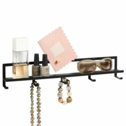 Brug hylden til makeup og smykker eller som krydderihylde i køkkenet. Så kan du passende hænge viskestykker og grydelapper på knagerne under hylden.