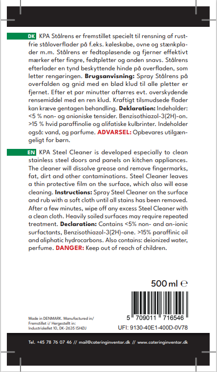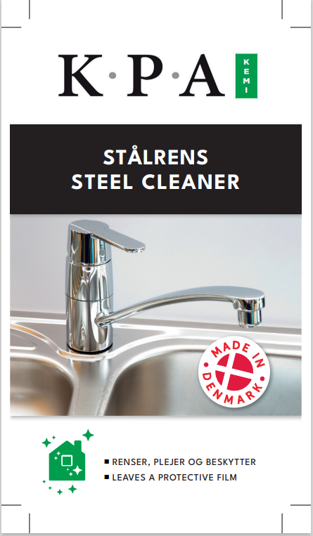 KPA Stålrens er fremstillet specielt til rensning af rust frie ståloverflader på f.eks. køleskabe, ovne og stænkpla der m.m. Stålrens er fedtopløsende og fjerner effektivt mærker efter fingre, fedtpletter og anden snavs. Stålrens efterlader en tynd beskyttende hinde på overfladen, som letter rengøringen.