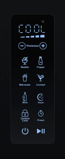 Intuitiv teknologi, personlig nydelse Med det elegante LED-touchdisplay vælger du let mellem 6 specialprogrammer og 5 forskellige teksturer. Uanset om du foretrækker en silkeblød shake eller en sprød, “crunchy” slush ice, leverer maskinen den perfekte konsistens på kun 15–40 minutter.