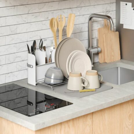 Opvaskestativet kombinerer gummimåtte og holder, så du kan stable og organisere tallerkener, glas, bestik, gryder og pander, mens de lufttørrer.