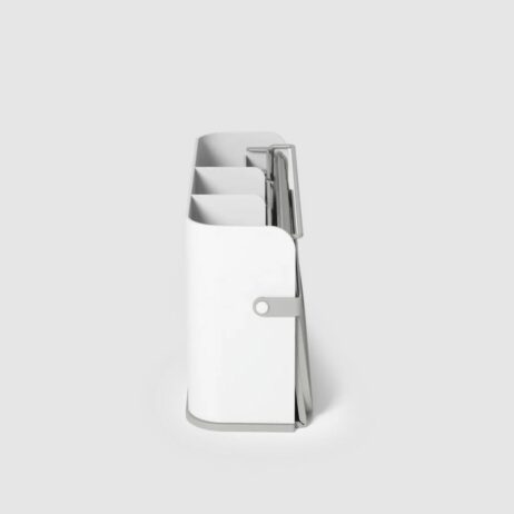 Opvaskestativet består af en sammenklappelig metalramme og en foldbar gummimåtte, som passer perfekt i den praktiske holder. Basen har tre separate rum, ideel til bestik, større redskaber og opvaskesvampe eller børster.