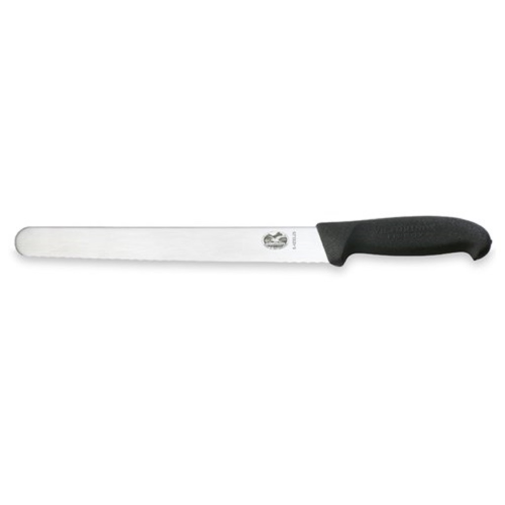 Kniven har en 25 cm lang klinge i poleret rustfrit stål med en unik bølgetægning, der sikrer skarpe og rene snit uden at mase eller ødelægge bløde brød og bagværk. Den rustfri klinge har en hårdhed på 55 HrC, hvilket giver en slidstærk og korrosionsbestandig overflade, der holder skarpheden i lang tid. Håndtaget i sort fibrox er ergonomisk formet med en ru tekstur, som giver et sikkert og behageligt greb, også ved fugtige eller fedtede hænder. Den lette vægt og det balancerede design gør kniven nem at håndtere ved gentagen brug, både i private køkkener og professionelle miljøer.