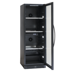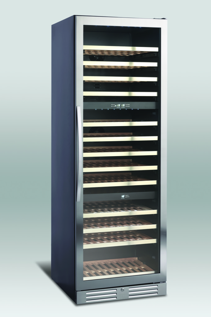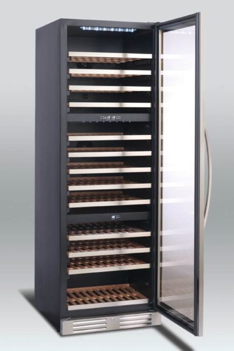 Den slanke, fritstående vinkøler måler 1762x595x677 mm og tilbyder en pladsbesparende løsning med høj kapacitet. Kabinettets solide konstruktion i rustfrit stål og bøgetræsudtrækshylder sikrer lang holdbarhed og reducerer vibrationer, der kan påvirke vinens kvalitet. Det elektroniske display og ventilationssystem sikrer ensartet temperatur og luftfugtighed, afgørende for vinens holdbarhed. Det gennemtænkte design med let tilgængelige hylder og ergonomiske håndtag gør daglig brug enkel og behagelig, hvilket gør vinkøleren til et pålideligt valg for vinentusiaster og professionelle køkkener, der vil kombinere funktionalitet med æstetik.