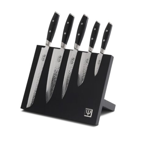 Dette magnetsæt i bøg kombinerer en elegant sort magnetplade med fem knive, der spænder fra 80 mm urtekniv til 230 mm brødkniv og dækker alle væsentlige køkkenopgaver. Knivene er fremstillet i 3-lags VG-10 damaskusstål, kendt for høj hårdhed, holdbarhed og skarphed, og har et hamret mønster, der reducerer friktion og forhindrer mad i at klistre. De ergonomiske skaft i slidstærkt Micarta sikrer et komfortabelt og sikkert greb. Magnetpladen i bøgetræ står stabilt og giver et overskueligt, pladsbesparende overblik, samtidig med at den beskytter klinger mod unødig slitage.