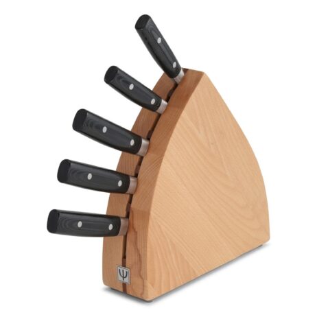 Dette knivsæt kombinerer en rustik bøgeknivblok med et sæt knive fremstillet af 37 lag VG-10 damaskusstål, kendt for skarphed, slidstyrke og korrosionsbestandighed. Knivblokken har en kompakt trekantet form med afrundede kanter og lodrette riller, der sikrer sikker og nem opbevaring. Den naturlige bøgefinér udstråler varme og tidløs elegance, mens knivenes sorte Micarta-håndtag med diskrete sølvnitter giver et ergonomisk og skridsikkert greb med optimal kontrol. Knivenes længder varierer fra 80 mm til 230 mm og dækker alle køkkenets behov, fra præcisionsskæring til brød og kød.