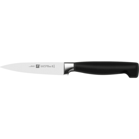 Kniven er konstrueret med et 10 cm langt blad i højkvalitets, højkarbon rustfrit stål, der sikrer langvarig skarphed og modstandsdygtighed mod rust og korrosion. Den sølvfarvede, polerede overflade fremhæver knivens professionelle finish og gør rengøringen enkel og hygiejnisk. Det sorte, matte håndtag er ergonomisk formet og fremstillet af slidstærkt, syntetisk materiale, der giver et sikkert og komfortabelt greb, selv når hænderne er fugtige eller fedtede. Den sømløse overgang mellem blad og håndtag minimerer bakterieophobning og bidrager til et elegant, strømlinet design, der passer perfekt til både private køkkener og professionelle miljøer.